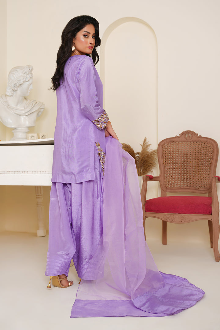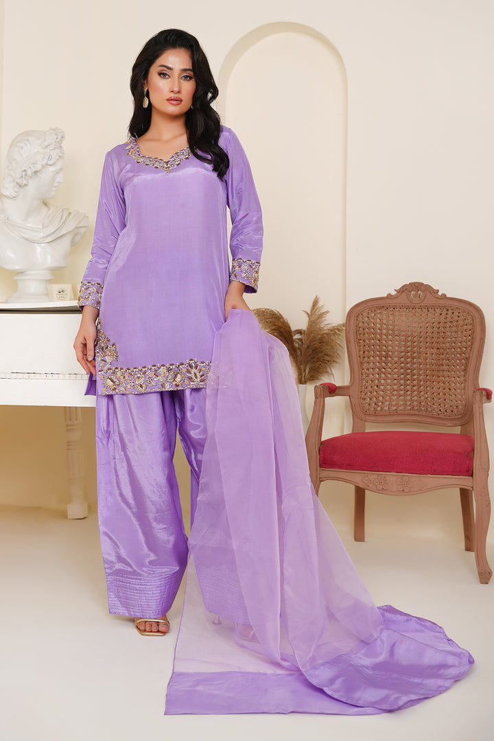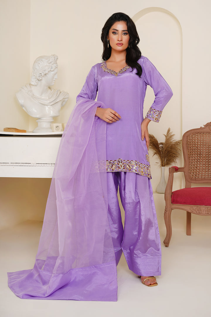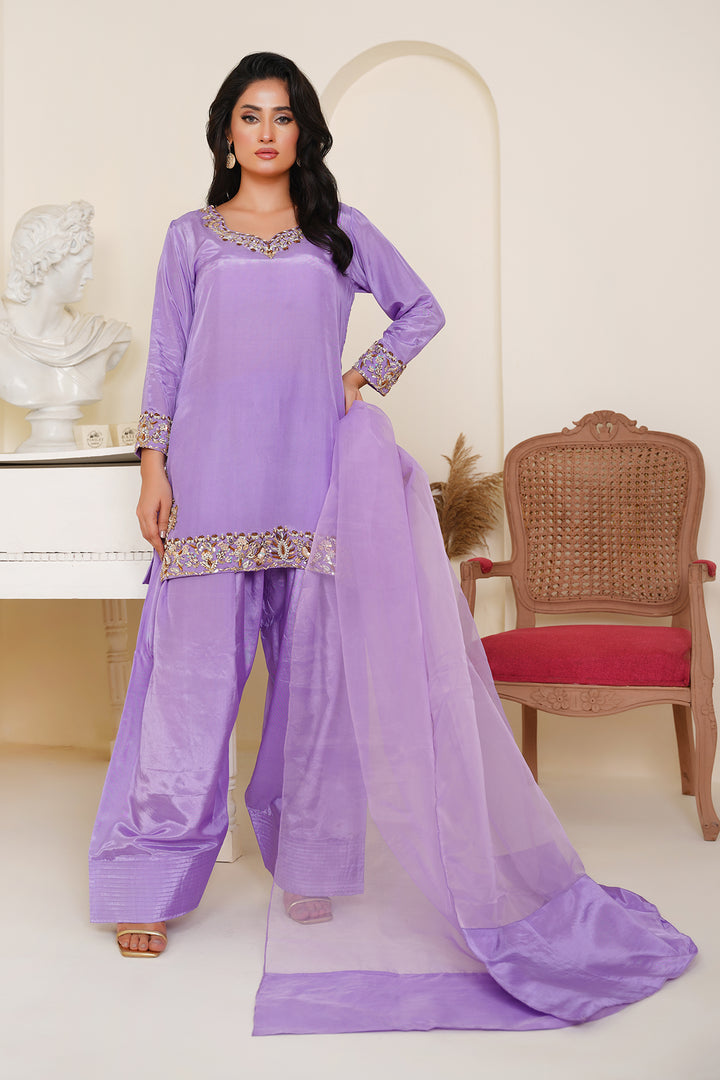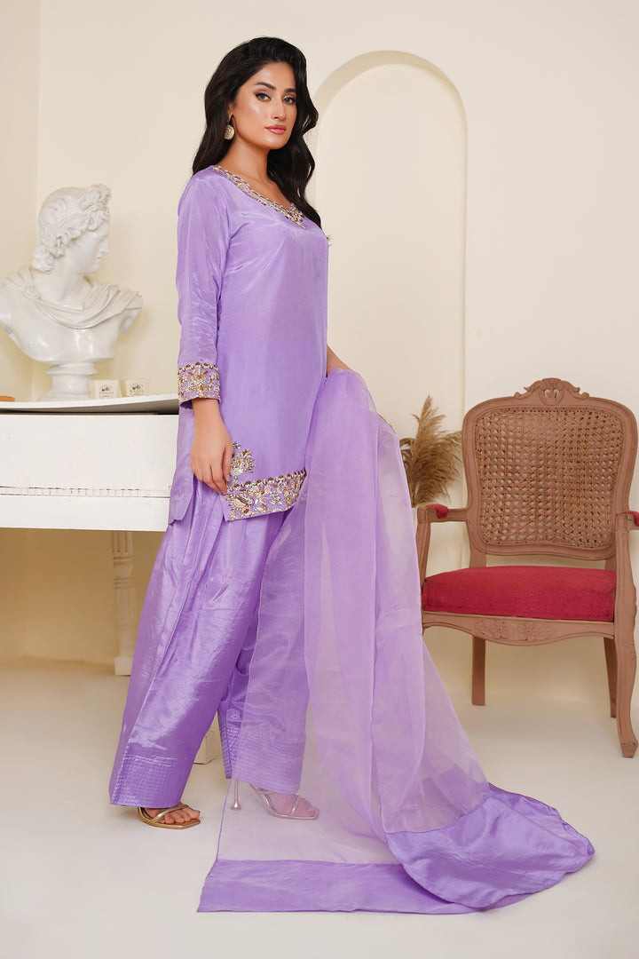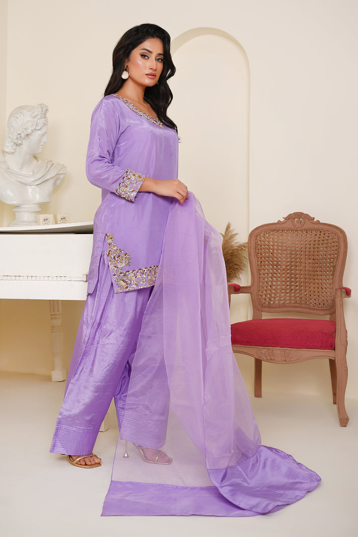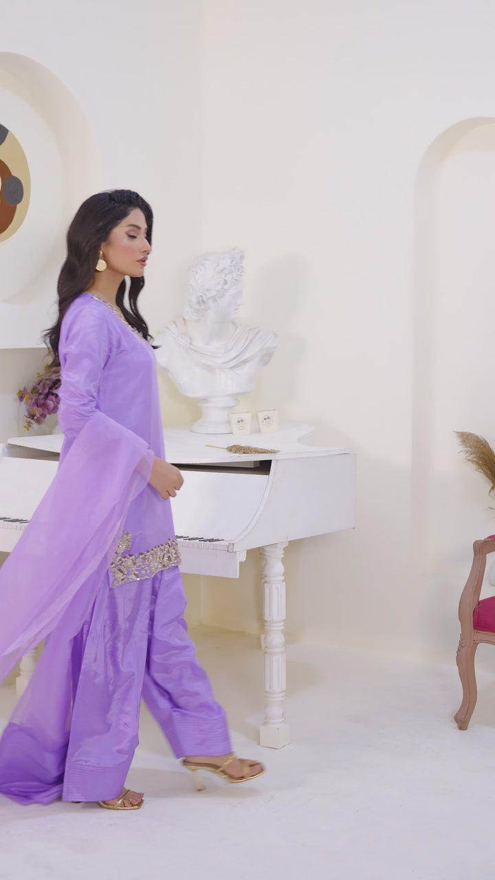 The shirt features delicate embellishments along the neckline, cuffs, and hem, handcrafted to perfection for an effortless festive glow. Paired with a trendy farshi shalwar — bringing back regal flair with a contemporary twist — and a flowy organza dupatta that completes the look with sheer grace.