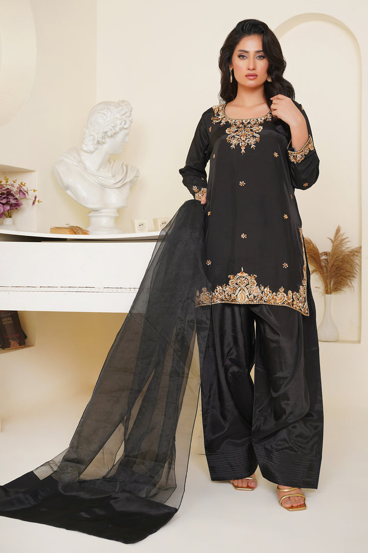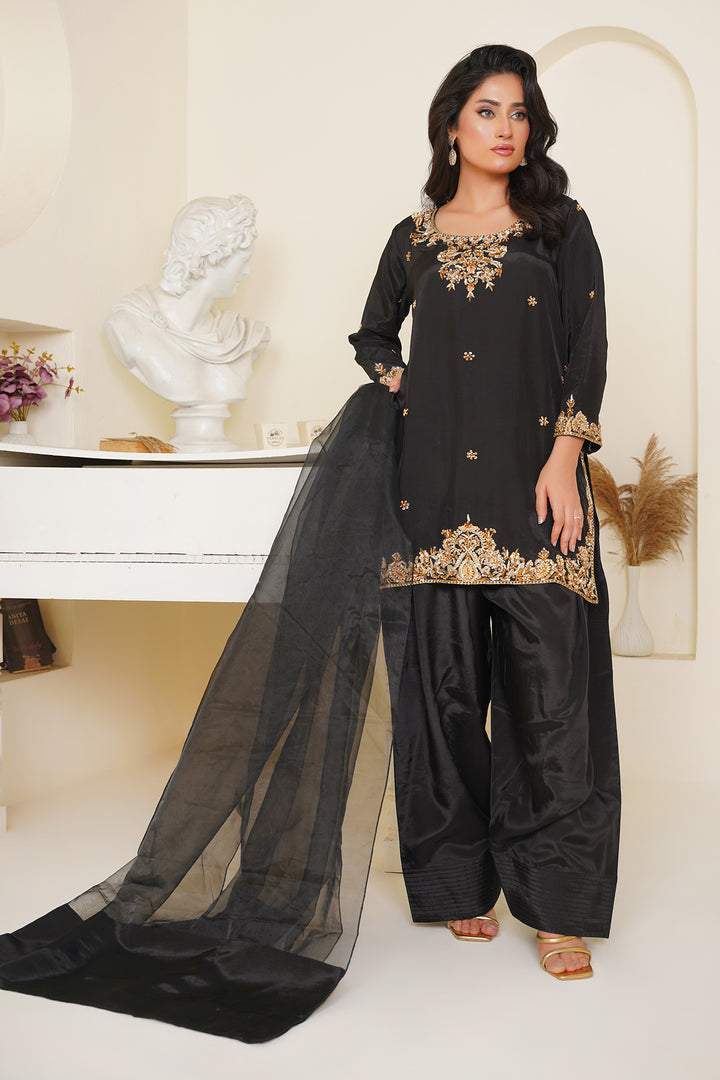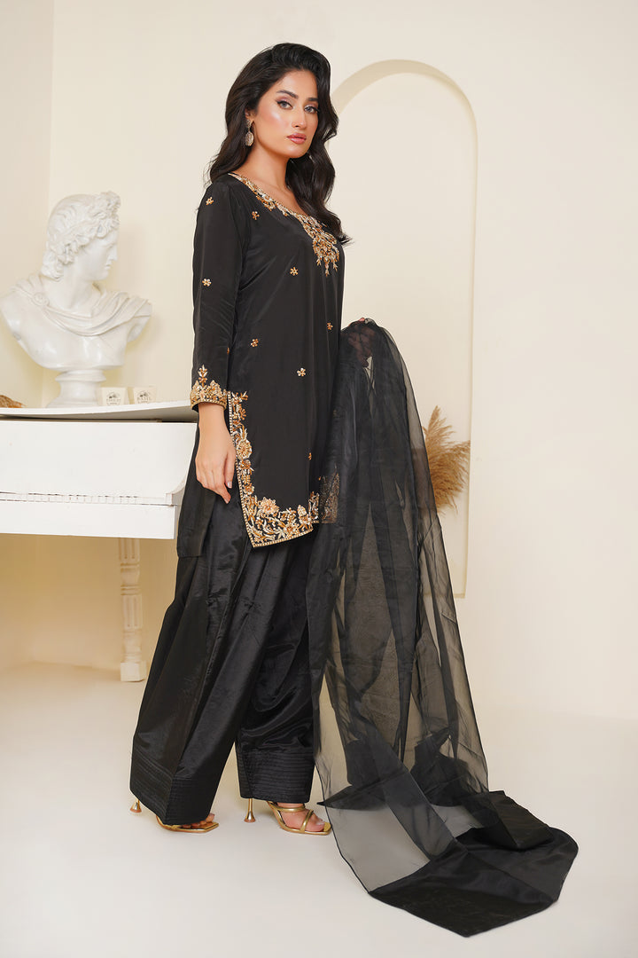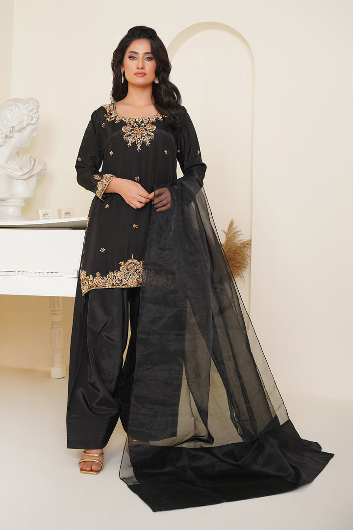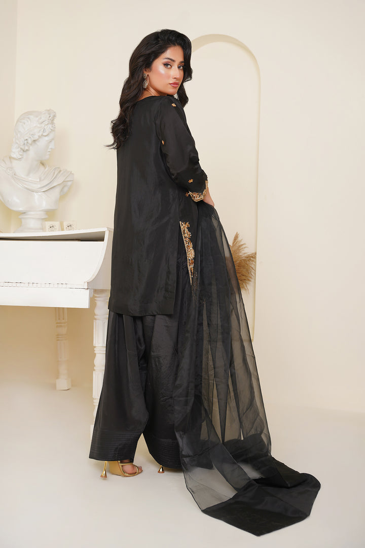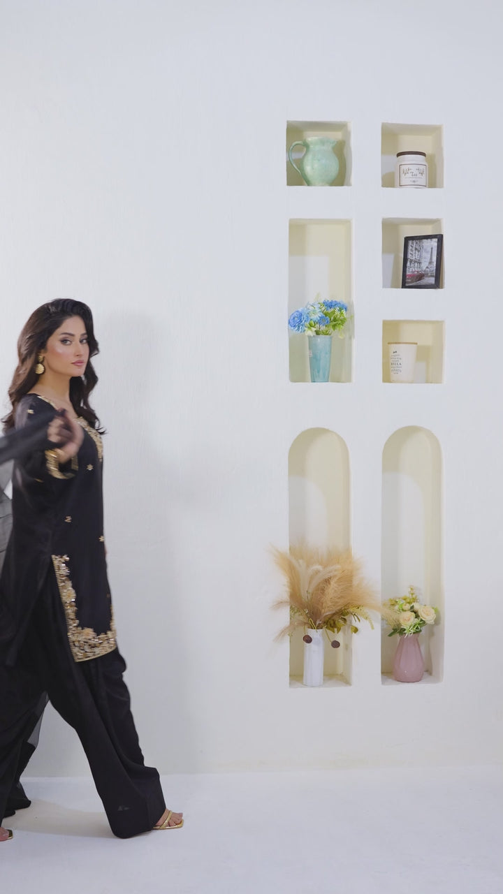 The flowing farshi shalwar brings a regal touch, while the soft organza dupatta adds layers of sophistication. Perfect for evening soirees, festive nights, or formal gatherings, Mehak captures the allure of timeless black with a modern Silkmire twist.